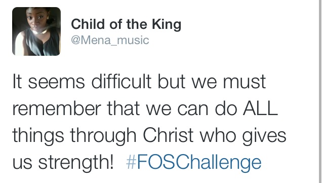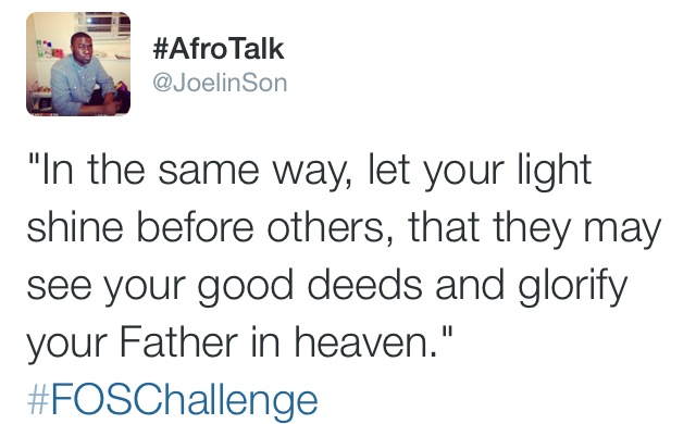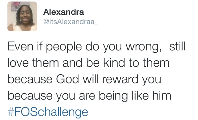 From today’s #FOSChallenge I learnt that God expects us to forgive people even when they hurt us so bad. There are no exceptions as to what kind of wrongs should be forgiven and those that shouldn’t, because God also forgave us of all our sins. We should tolerate one another, bear with each other. Also we are to love the unloved, helping people out in whatever capacity that we are able to. Providing food, clothes, shelter etc. – Tolu Nancy Ogunleye