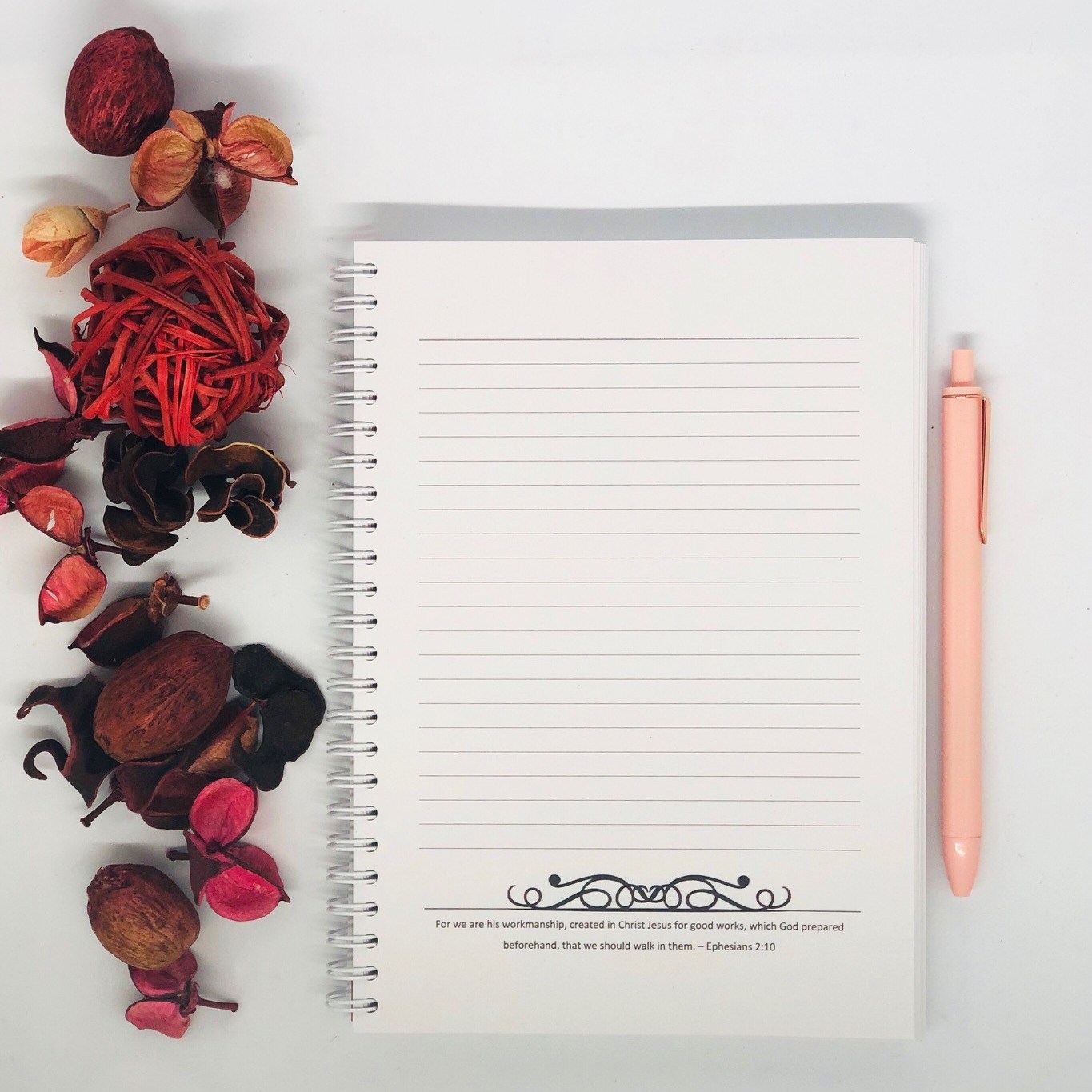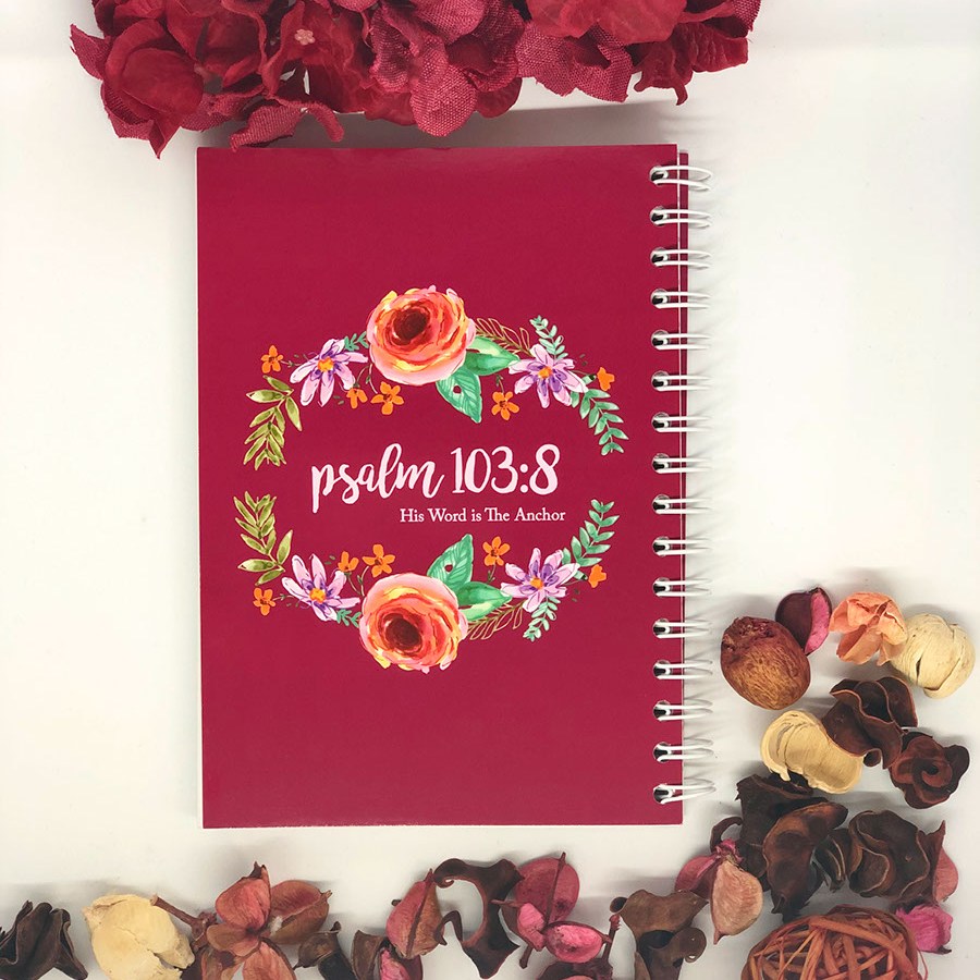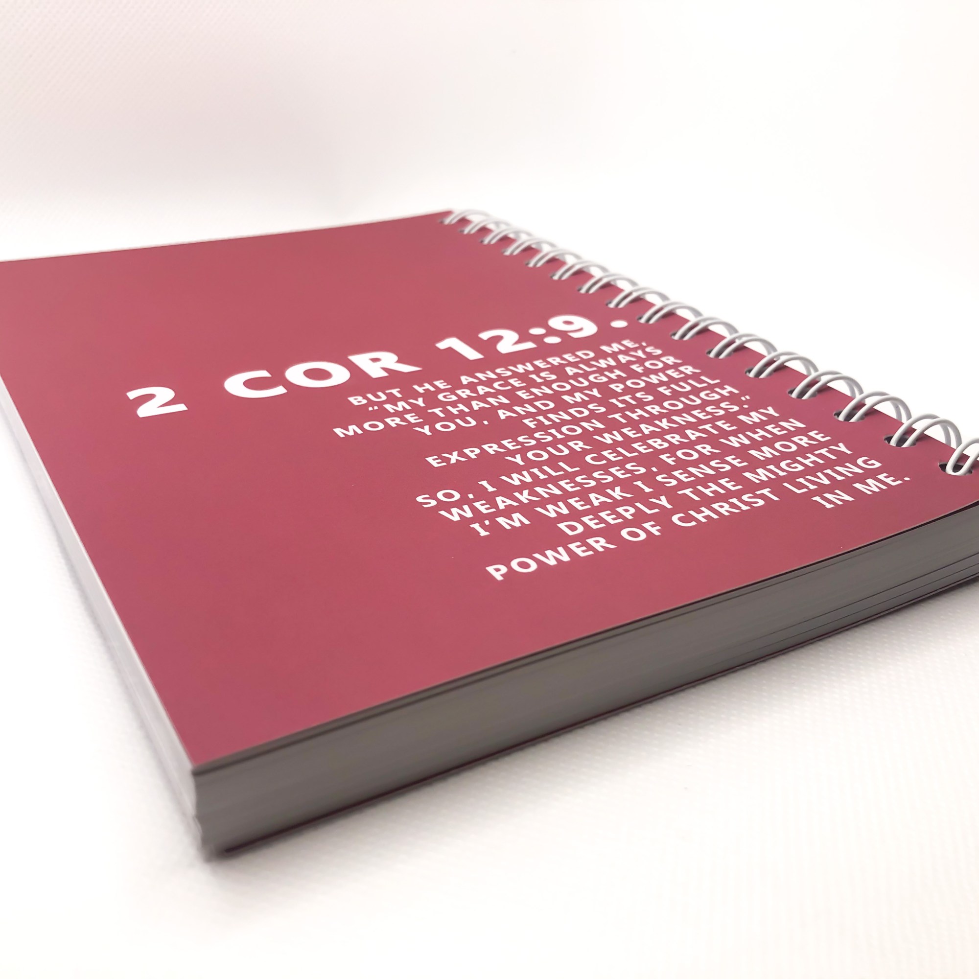 This spiral journal measures approximately 5″x8″, and features 154 pages of 130gsm quality lined paper, each with a scripture at the bottom.