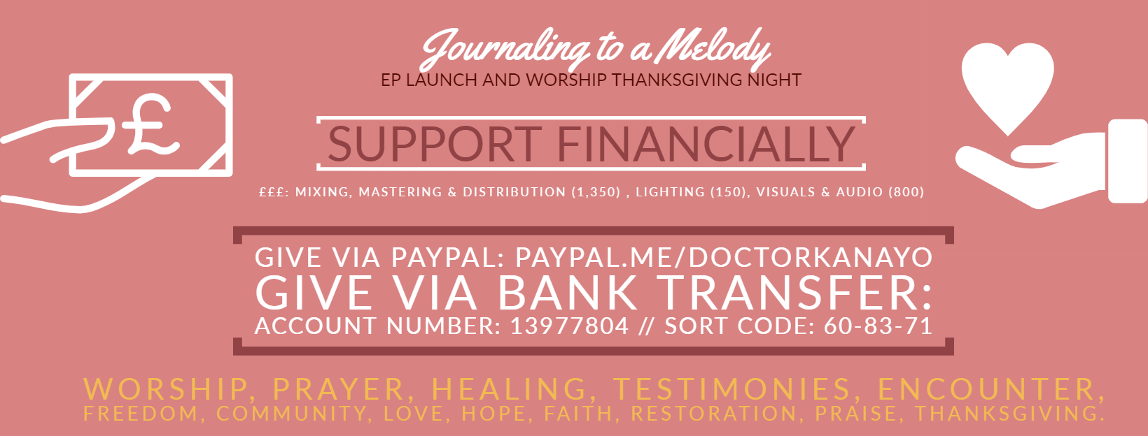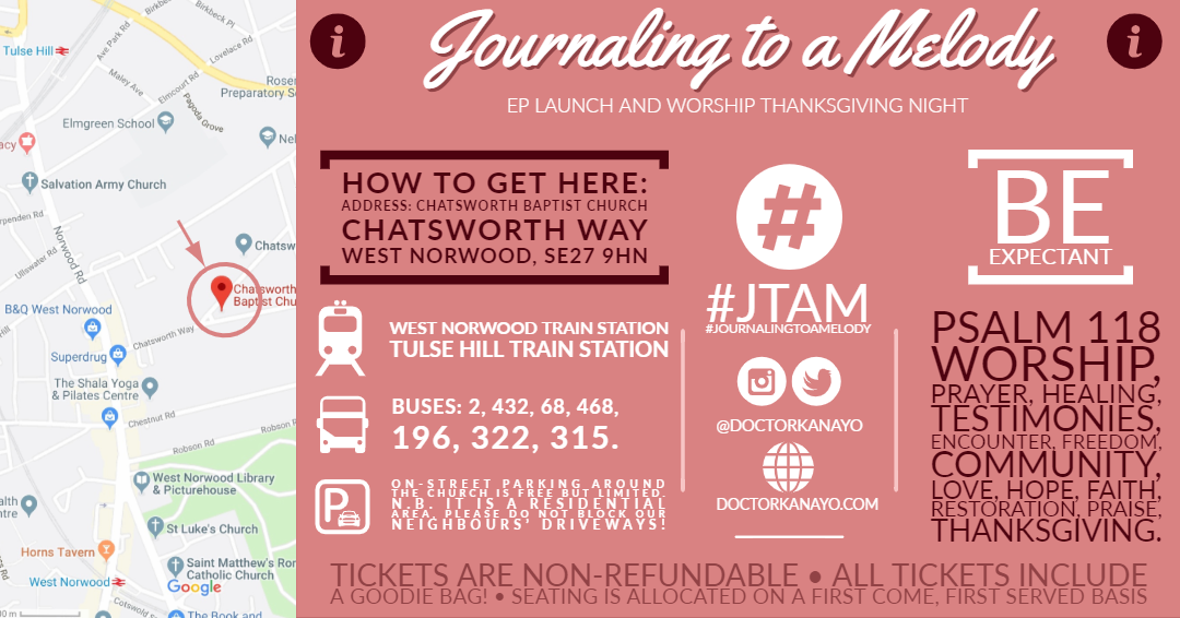 On 7th December 2019, I will be having an event in London to celebrate and give thanks for my recovery. This thanksgiving event will incorporate the release of my six-song EP, Journaling To A Melody; raise awareness about Stevens-Johnson syndrome and the need for greater support, teaching and research in correctly diagnosing people of colour; and finally be a time of community and shared thanksgiving through song and creative items.