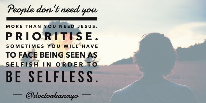 I'm Selfish... Let me rephrase that. I may appear ‘selfish’ to others and you may appear selfish too…but that’s okay. You’re not a selfish person by the dictionary’s standards. The staunch definition of selfish is: devoted to or caring for oneself; concerned primarily with one's own interests, benefits, welfare, etc., regardless of others. I agree with the definition minus the last part that says, ‘regardless of others’ or ‘at the expense of others’. I … Continue reading ‘I’m Selfish…’