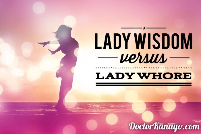 READ: Proverbs 9 NIV and MESSAGE versions were great to read. This blog is based on Proverbs chapter 9, which I read during my break at work today and was blown away! Join me in my excitement. Back one chapter: Earlier on in Proverbs 8:22-31, it says that wisdom was present when God created the foundations … Continue reading Lady Whore and Lady Wisdom